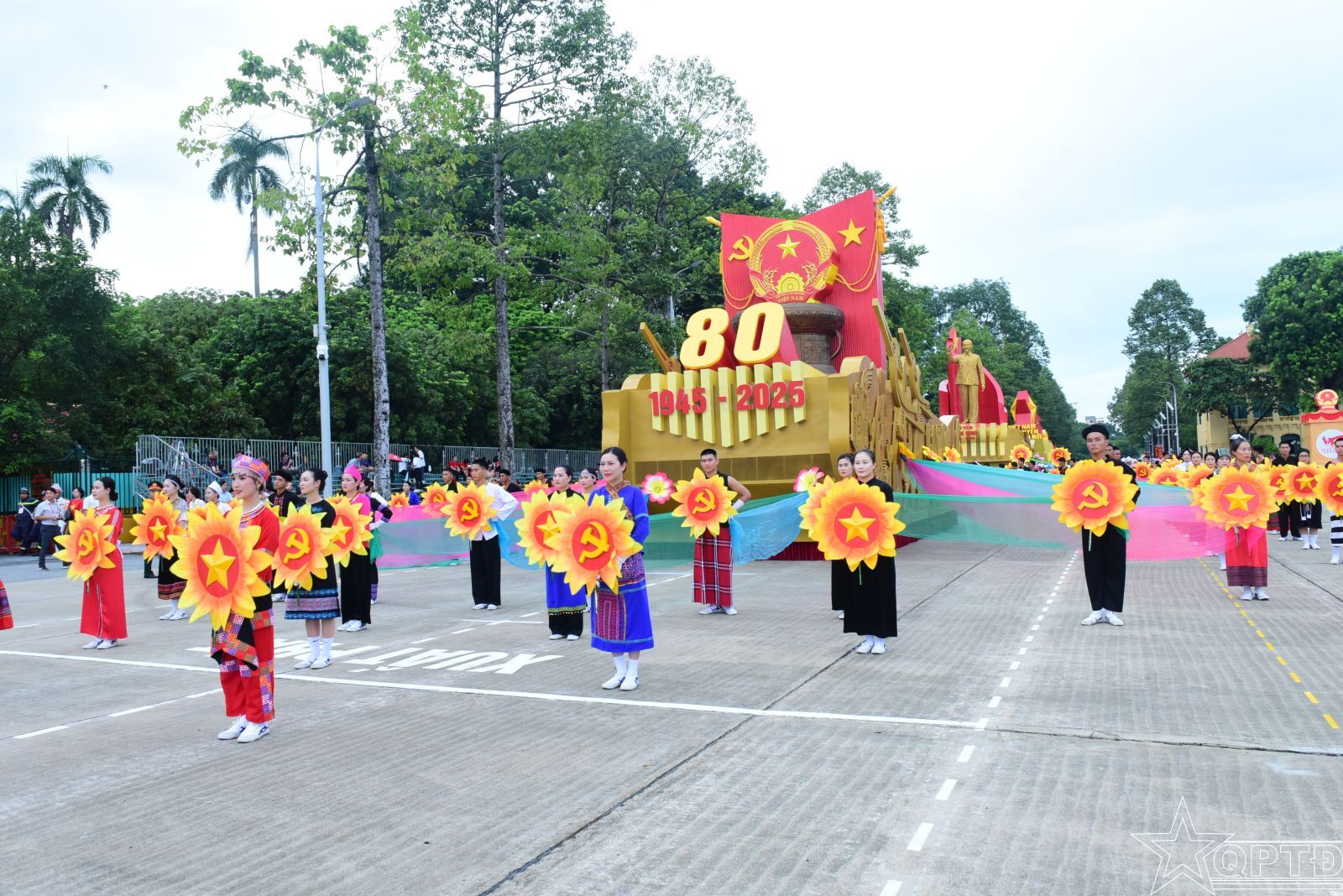 Trong không khí tưng bừng của ngày Tết Độc lập, non sông hội tụ về đây, kỷ niệm trang sử vàng chói lọi của dân tộc. Khối xe Nghi trượng không chỉ là linh hồn, mà còn là “trái tim” dẫn dắt hành trình tri ân lịch sử, gợi nhắc những giá trị thiêng liêng của dân tộc. Hình ảnh ấy lan tỏa cảm xúc dâng trào, thổi bùng khí thế hào hùng, khơi dậy niềm tự hào và tinh thần bất khuất trong mỗi con người Việt Nam. Đi đầu là Quốc huy nước Cộng hòa xã hội chủ nghĩa Việt Nam. Thân xe được phát triển từ họa tiết “chèo thuyền” gắn liền với trống đồng, biểu tượng của tinh thần đại đoàn kết dân tộc Việt Nam, nguyện một lòng đi theo con đường XHCN mà Đảng, Bác Hồ và nhân dân ta đã lựa chọn; đưa “Con thuyền Cách mạng Việt Nam” cập bến bờ vinh quang, hạnh phúc. Đội hình 54 trai tài gái giỏi đại diện cho 54 dân tộc anh em đoàn kết, với sức mạnh vô địch, làm nên chiến thắng trong thời đại Hồ Chí Minh rực rỡ. Theo sau là đội hình xe rước chân dung Chủ tịch Hồ Chí Minh và đội hình xe mô hình biểu tượng 80 năm Cách mạng Tháng 8 và Quốc khánh nước CHXHCN Việt Nam. Biểu tượng mang ý nghĩa sâu sắc, tái hiện mốc son lịch sử chói lọi của cả dân tộc với khát vọng “độc lập, tự do, hạnh phúc” và quyết tâm mạnh mẽ đưa đất nước ta đi tới tương lai tươi sáng. Khối cờ Tổ quốc được tạo hình mang tinh thần sức mạnh, với khí thế “vươn mình, cất cánh”, tượng trưng cho ước nguyện “dân tộc cường thịnh, trường tồn - đất nước phồn vinh, hạnh phúc” trong kỷ nguyên mới, kỷ nguyên vươn mình của dân tộc.