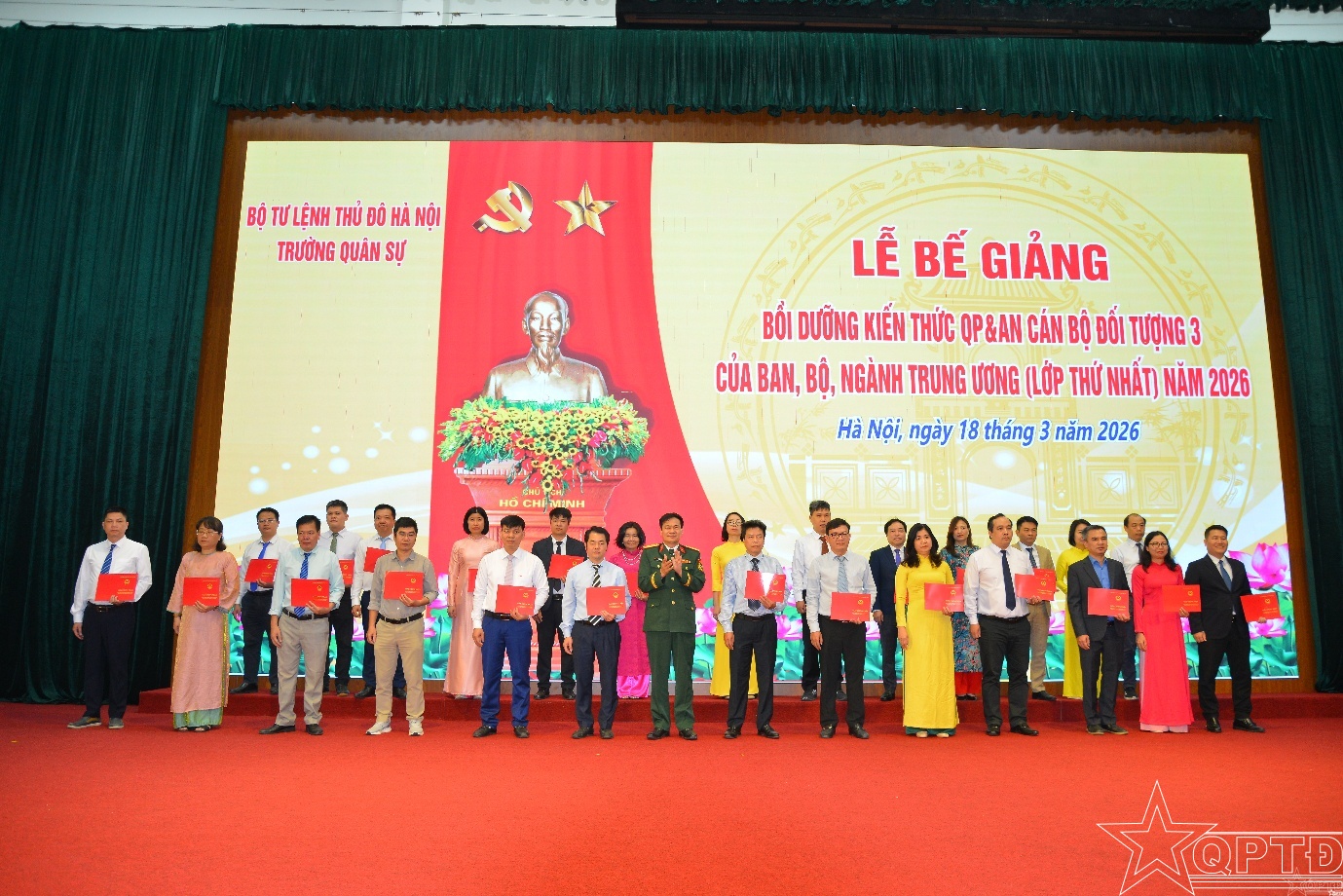 QPTĐ-Chiều 18-3, Trường Quân sự Bộ Tư lệnh Thủ đô Hà Nội tổ chức Lễ Bế giảng Lớp bồi dưỡng kiến thức quốc phòng và an ninh (QP&AN) cán bộ đối tượng 3 của các ban, bộ, ngành Trung ương (lớp thứ nhất) năm 2026.