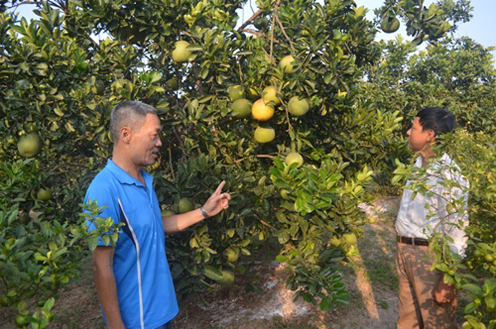 Cựu chiến binh Cao Đình Sơn (áo xanh) chia sẻ niềm vui bên vườn bưởi Diễn.
