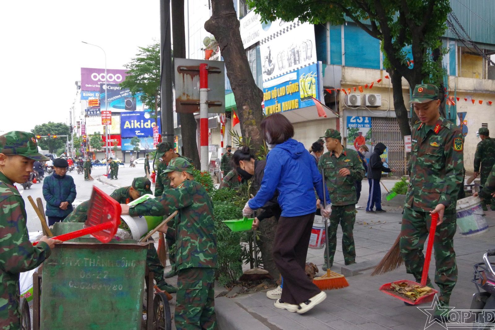 Cán bộ, chiến sĩ Tiểu đoàn phối hợp với đoàn viên thanh niên tham gia vệ sinh môi trường, làm đẹp cảnh quan đô thị trên địa bàn phường.