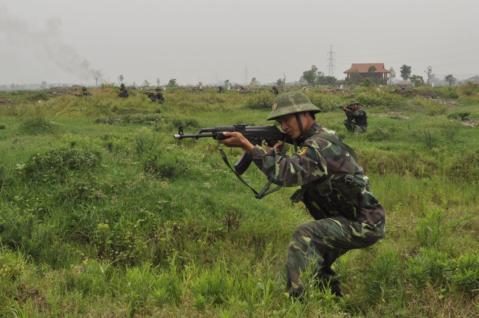 Khu vực thực binh đánh địch đổ bộ đường không trong cuộc diễn tập khu vực phòng thủ huyện được bố trí tại Dự án khu đô thị Thanh Hà với địa hình bằng phẳng. Ở vị trí sẵn sàng chiến đấu, Đại đội trưởng Đại đội 3, Tiểu đoàn Bộ đội địa phương huyện Nguyễn Trọng Tâm nhắc nhở anh em chiến sĩ trong đơn vị tập trung theo dõi hiệu lệnh của chỉ huy, cơ động chiếm lĩnh trận địa, đánh địch theo phương án đã xác định.