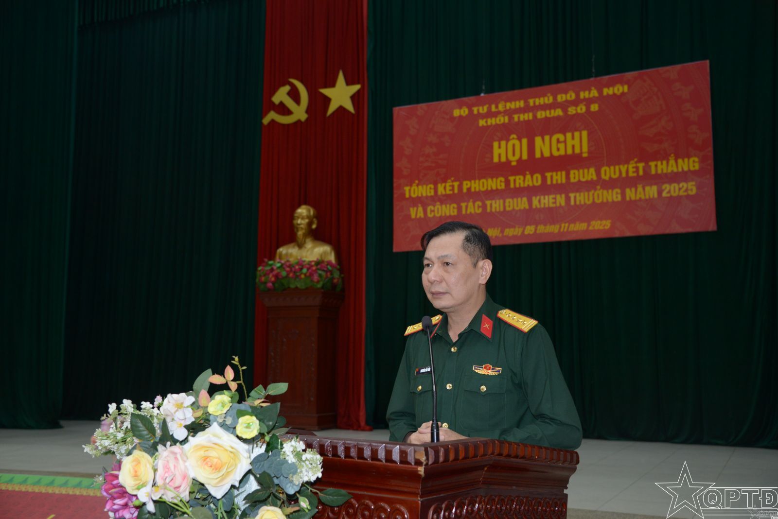 Phát biểu tại Hội nghị, Đại tá Nguyễn Văn Hữu đã ghi nhận và đánh giá cao kết quả các đơn vị đã đạt được trong năm 2025. Thời gian tới, đồng chí Chủ nhiệm Chính trị Bộ Tư lệnh Thủ đô Hà Nội yêu cầu các đơn vị trong Khối cần tập trung thực hiện tốt một số nội dung như: Tích cực tuyên truyền, quán triệt nghiêm túc các văn bản của cấp trên về công tác thi đua-khen thưởng và Phong trào Thi đua Quyết thắng; tổ chức triển khai thực hiện phong trào thi đua phải có chiều sâu, tạo sức lan tỏa, thực sự là động lực thúc đẩy cán bộ, chiến sĩ vượt qua mọi khó khăn, phấn đấu hoàn thành tốt mọi nhiệm vụ được giao; làm tốt công tác quản lý bộ đội, chủ động nắm bắt tâm tư, tình cảm, kịp thời có biện pháp giải quyết, kiên quyết không để tình trạng vi phạm kỷ luật xảy ra. Đồng thời, các đơn vị trong Khối cần giữ vững mối đoàn kết, tích cực trao đổi học tập những cách làm hay, sáng tạo cũng như thường xuyên tổ chức rút kinh nghiệm, đề ra các biện pháp khắc phục nhằm nâng cao hơn nữa chất lượng tổ chức thực hiện công tác thi đua-khen thưởng và Phong trào Thi đua Quyết thắng…