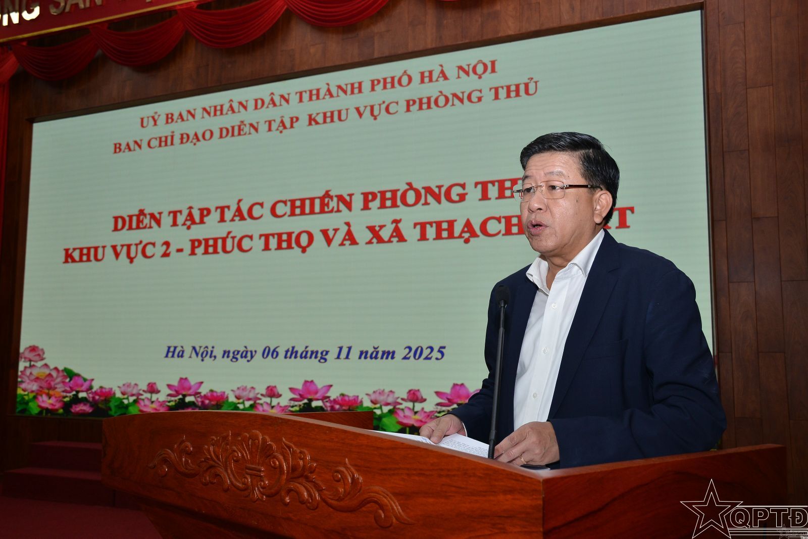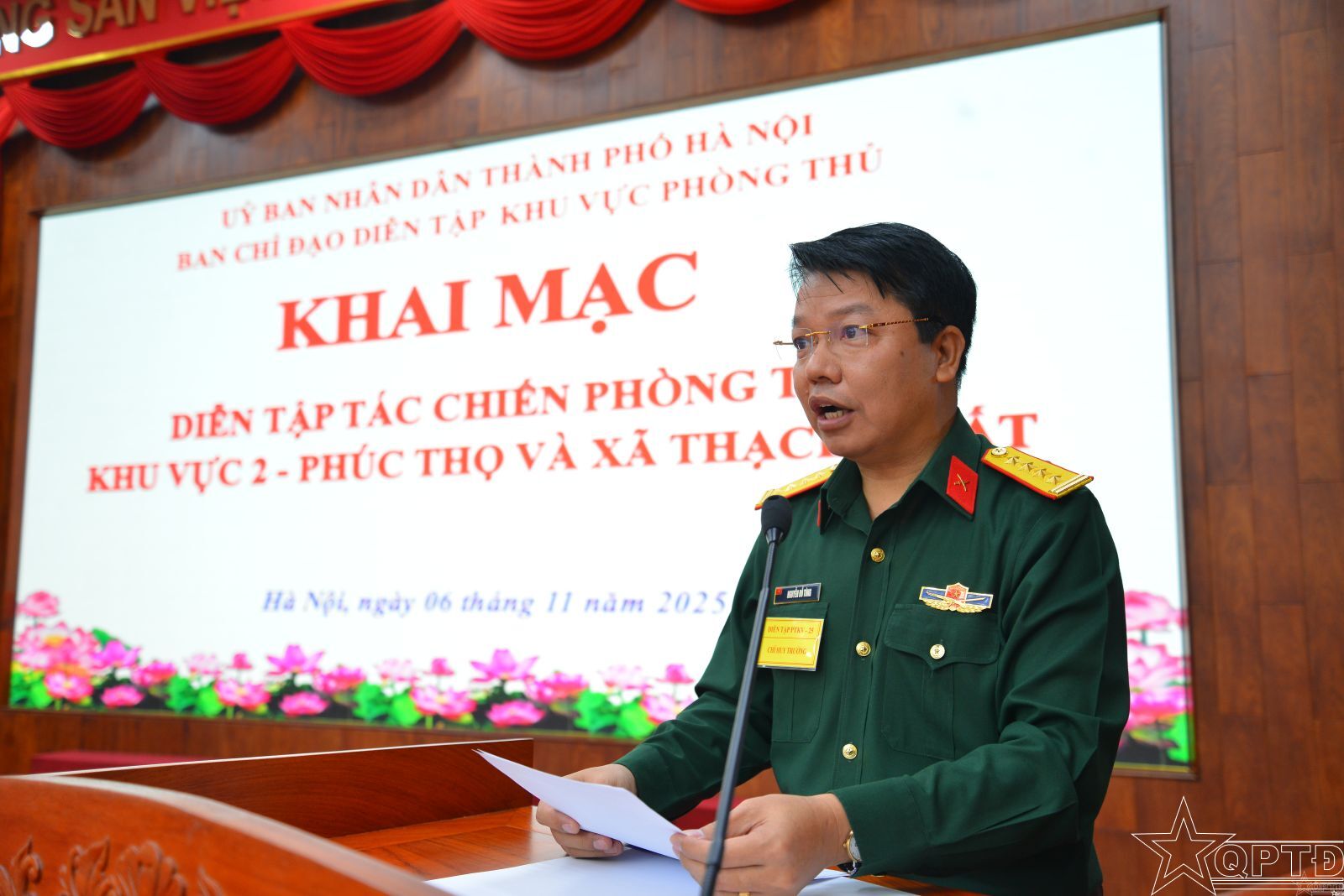Phát biểu khai mạc diễn tập, Đại tá Nguyễn Đỗ Tùng, Chỉ huy trưởng Ban Chỉ huy phòng thủ khu vực 2-Phúc Thọ cho biết: Chấp hành Chỉ thị số 342 ngày 12/9/2025 của UBND thành phố Hà Nội, Kế hoạch 4039 ngày 01/10/2025 của Ban Chỉ đạo về diễn tập tác chiến phòng thủ cho Ban Chỉ huy phòng thủ khu vực 2-Phúc Thọ và xã Thạch Thất năm 2025, Đảng ủy, Ban Chỉ huy phòng thủ khu vực 2- Phúc Thọ và Đảng ủy xã Thạch Thất đã ban hành đầy đủ các văn bản lãnh đạo, chỉ đạo, phân công nhiệm vụ cho các thành viên chặt chẽ; tổ chức tập huấn, luyện tập, sơ duyệt, tổng duyệt và hoàn thành mọi công tác chuẩn bị cho diễn tập.