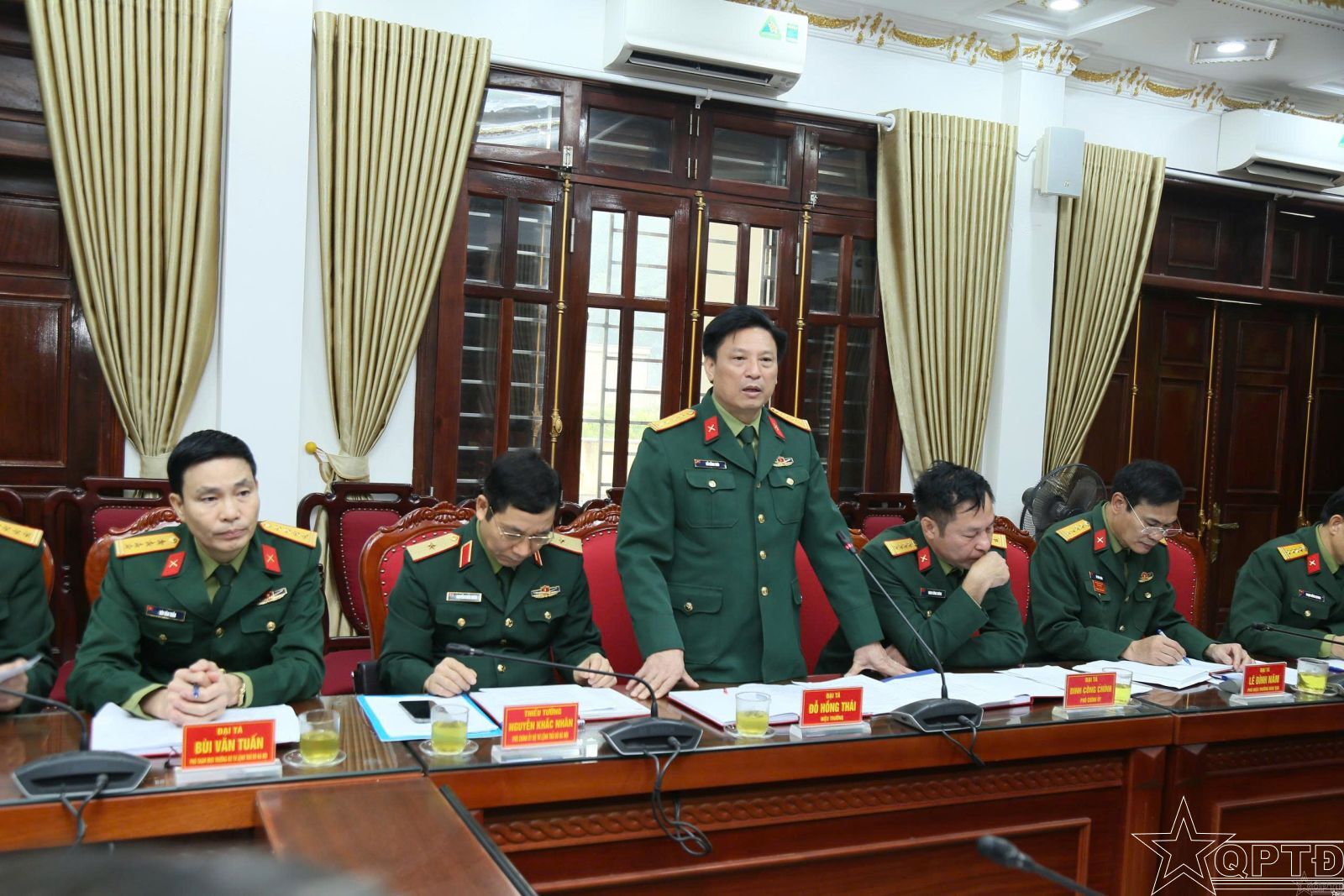 Đại tá Đỗ Hồng Thái, Hiệu trưởng Trường Quân sự Bộ Tư lệnh Thủ đô Hà Nội phát biểu tại buổi làm việc.