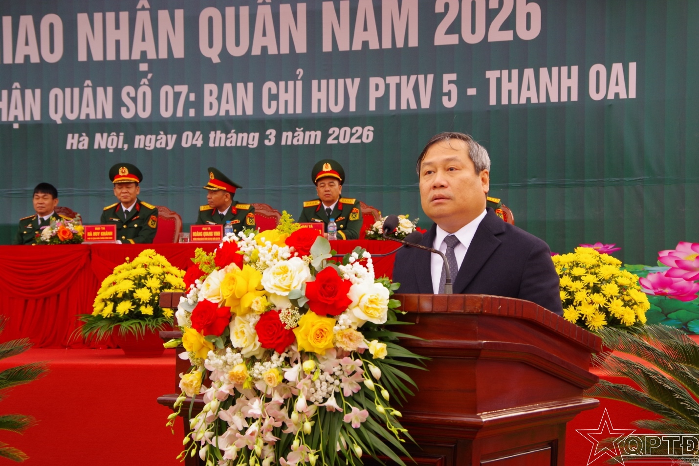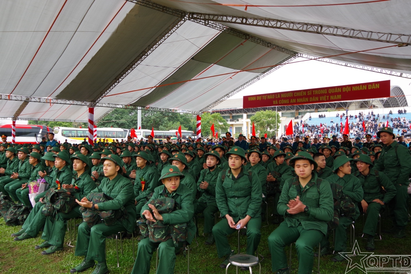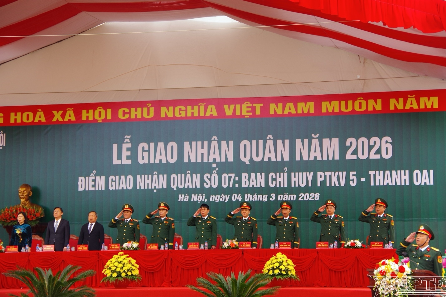 QPTĐ-Sáng 4-3, tại Ban Chỉ huy phòng thủ khu vực 5 - Thanh Oai đã diễn ra Lễ giao nhận quân năm 2026 và động viên các tân binh lên đường thực hiện nghĩa vụ quân sự, nghĩa vụ tham gia Công an nhân dân.