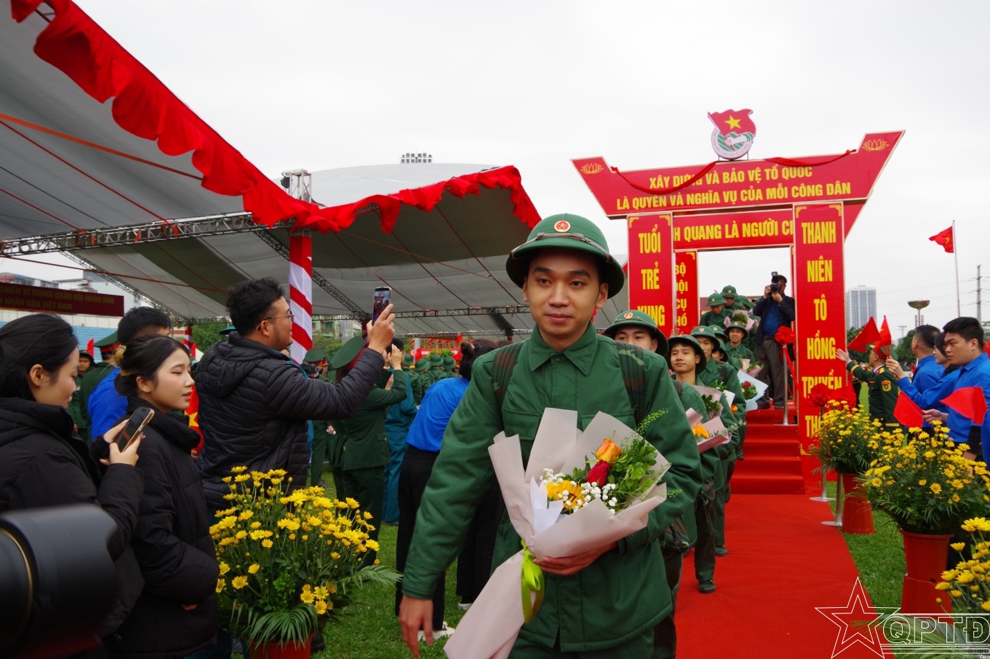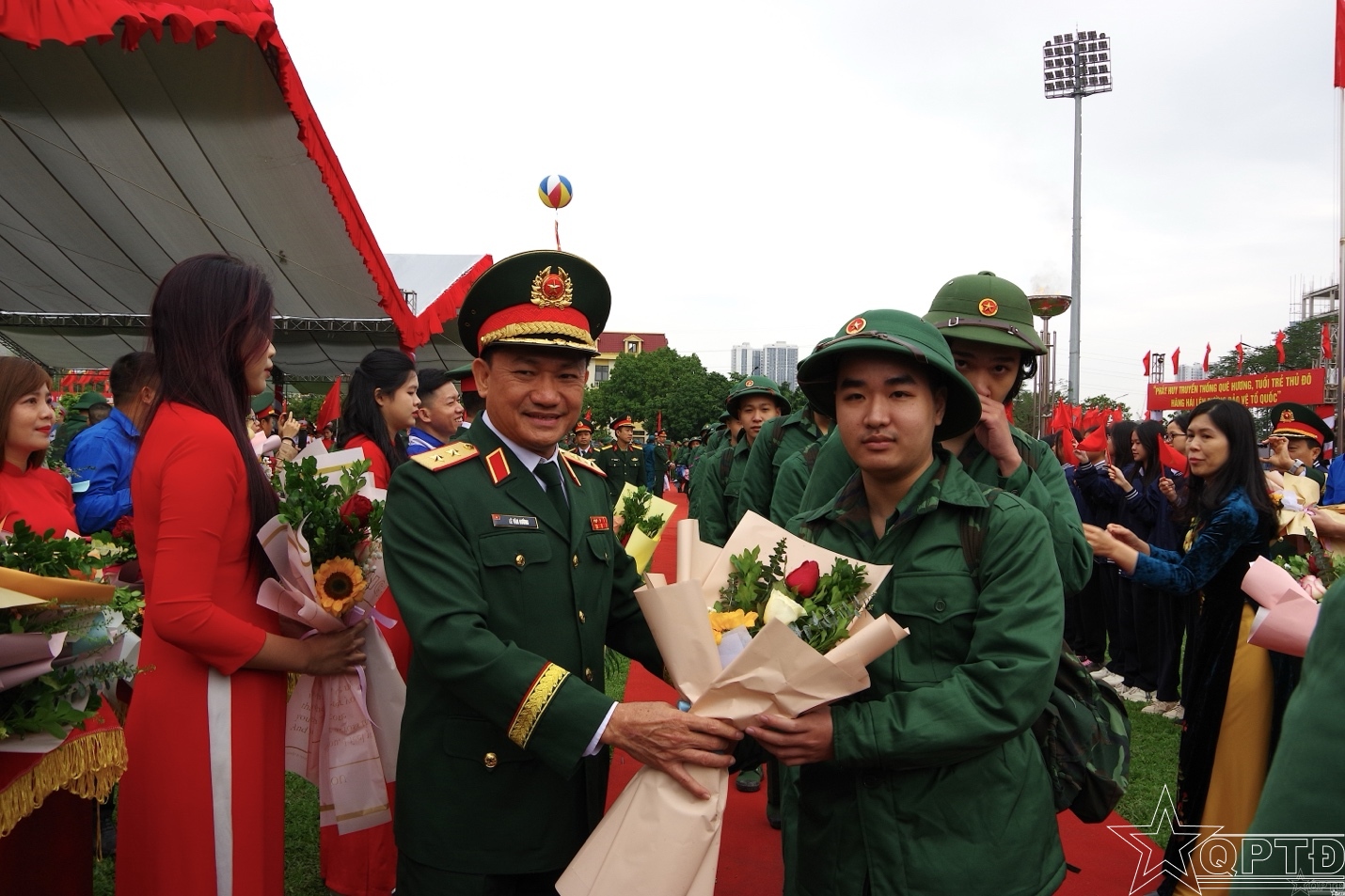 Thiếu tướng Lưu Nam Tiến, Thành uỷ viên, Phó Bí thư Thường trực Đảng uỷ, Chính uỷ Bộ Tư lệnh Thủ đô Hà Nội tặng hoa, động viên các tân binh lên đường nhập ngũ.