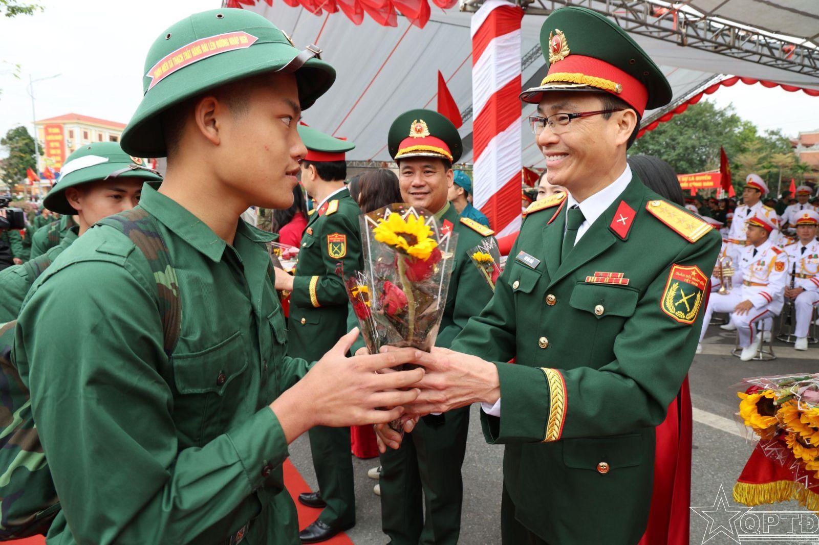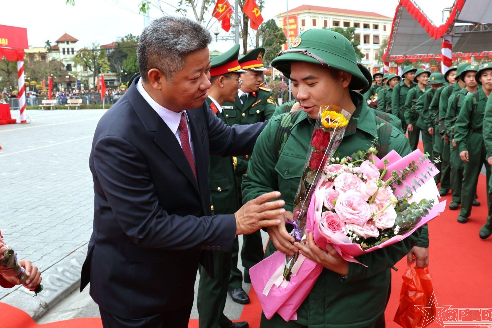 Đại biểu tặng hoa cho thanh niên lên đường nhập ngũ.