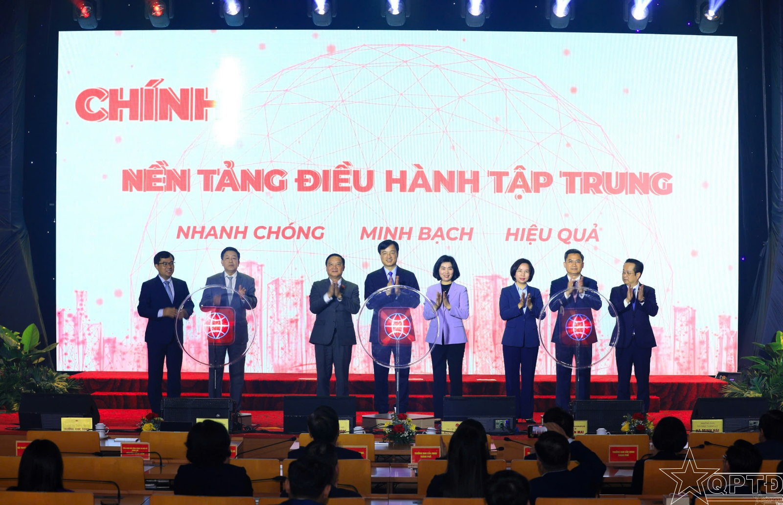 Bí thư Thành ủy Hà Nội Nguyễn Duy Ngọc, Phó Chủ tịch Quốc hội Nguyễn Khắc Định cùng các đồng chí lãnh đạo thành phố Hà Nội thực hiện nghi thức khai trương nền tảng Điều hành.