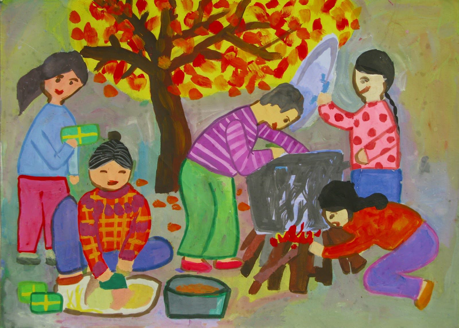 Để chúng tôi không ngủ gật, bố tôi đàn, hát, kể chuyện các dân tộc vùng biên giới đón Xuân, vui lắm. Mẹ tôi hiền hậu ngồi bên, vừa giữ lửa vừa xoay những ấm nước và nồi nước lá mùi, lá sả để cho bố con tôi tắm sạch sẽ, thơm tho đón giao thừa. Bỗng bố tôi nảy ra ý kiến: