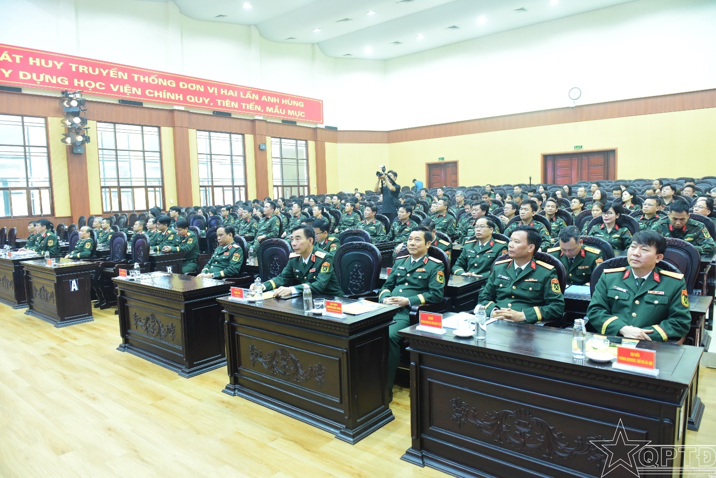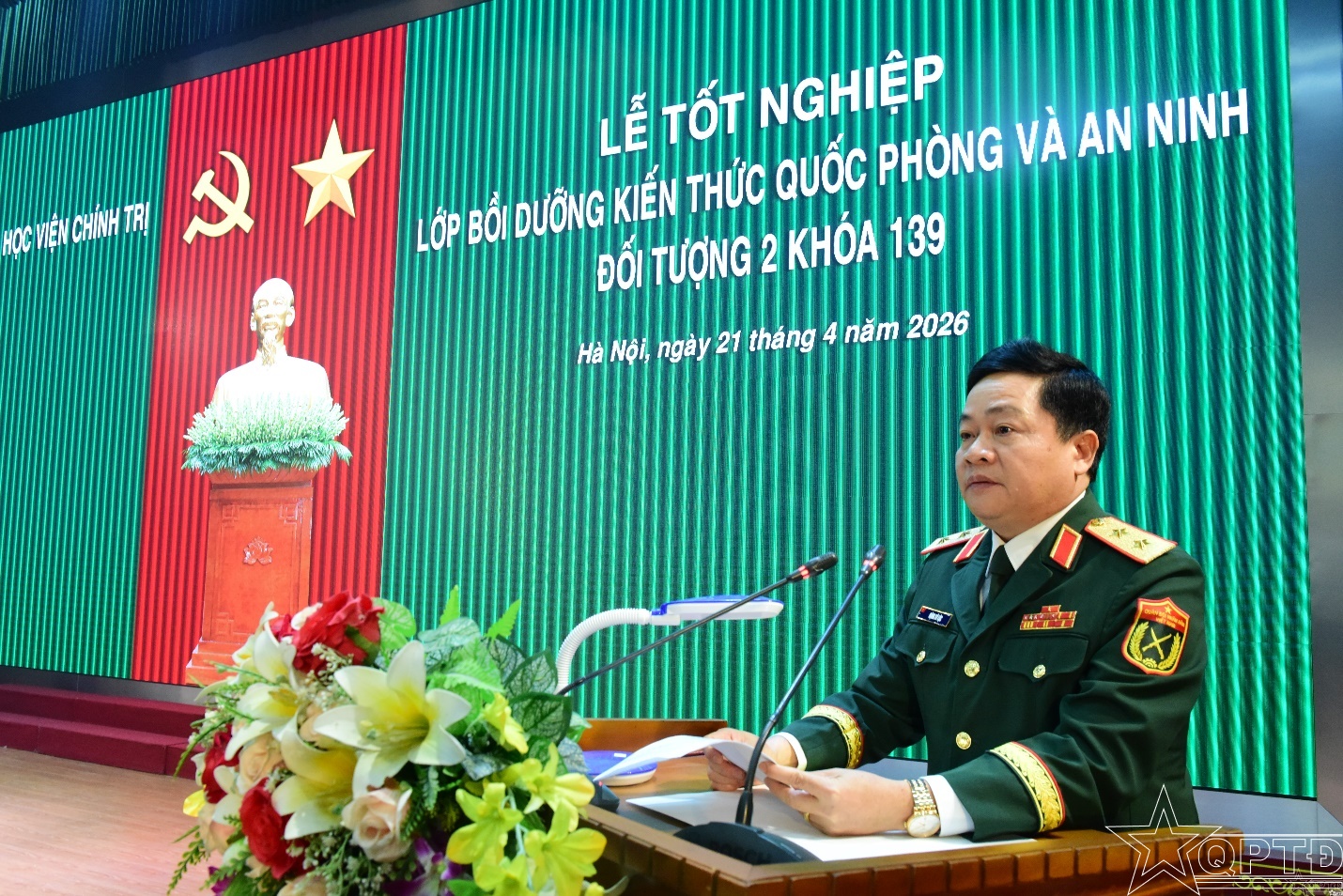 Phát biểu tại buổi lễ, Trung tướng Đặng Sĩ Lộc, Giám đốc Học viện Chính trị nhấn mạnh: Trong bối cảnh tình hình thế giới và khu vực có nhiều diễn biến phức tạp. Các cuộc chiến tranh, xung đột quân sự diễn ra ở nhiều nơi. Tại khu vực Trung Đông, cuộc xung đột giữa Mỹ, Israel và Iran tiếp tục leo thang, tác động mạnh mẽ đến an ninh, chính trị và an ninh năng lượng toàn cầu. Việc bồi dưỡng kiến thức QP&AN cho đội ngũ cán bộ lãnh đạo, quản lý là nhiệm vụ then chốt. Đây không chỉ là yêu cầu bắt buộc theo quy định mà còn là cơ sở để các đồng chí cán bộ nhận thức sâu sắc hơn về đường lối quân sự của Đảng, từ đó vận dụng linh hoạt vào công tác tham mưu, quản lý tại đơn vị mình.