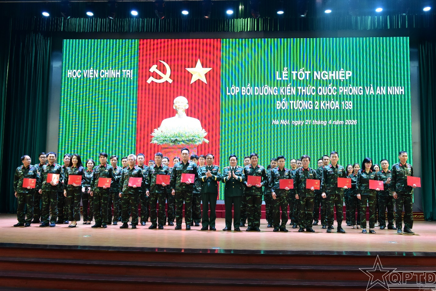 Kết thúc khóa học, lãnh đạo Học viện Chính trị đã trao chứng nhận tốt nghiệp Lớp bồi dưỡng kiến thức quốc phòng và an ninh đối tượng 2 khóa 139 cho các học viên.