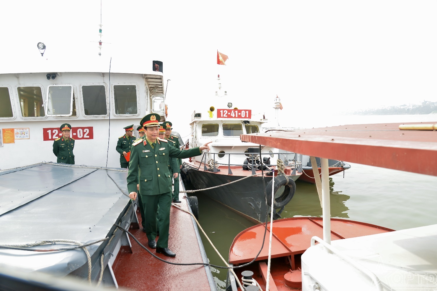 Thiếu tướng Nguyễn Đình Thạo, Phó Tư lệnh kiêm Tham mưu trưởng Bộ Tư lệnh kiểm tra các phương tiện tàu, xuồng tại Cảng quân sự.