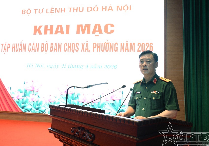 QPTĐ-Sáng 21-4, Bộ Tư lệnh Thủ đô Hà Nội tổ chức khai mạc tập huấn cán bộ Ban CHQS xã, phường năm 2026. Thiếu tướng Đào Văn Nhận, Ủy viên Ban Thường vụ Thành ủy, Tư lệnh Bộ Tư lệnh Thủ đô Hà Nội dự, phát biểu chỉ đạo.
