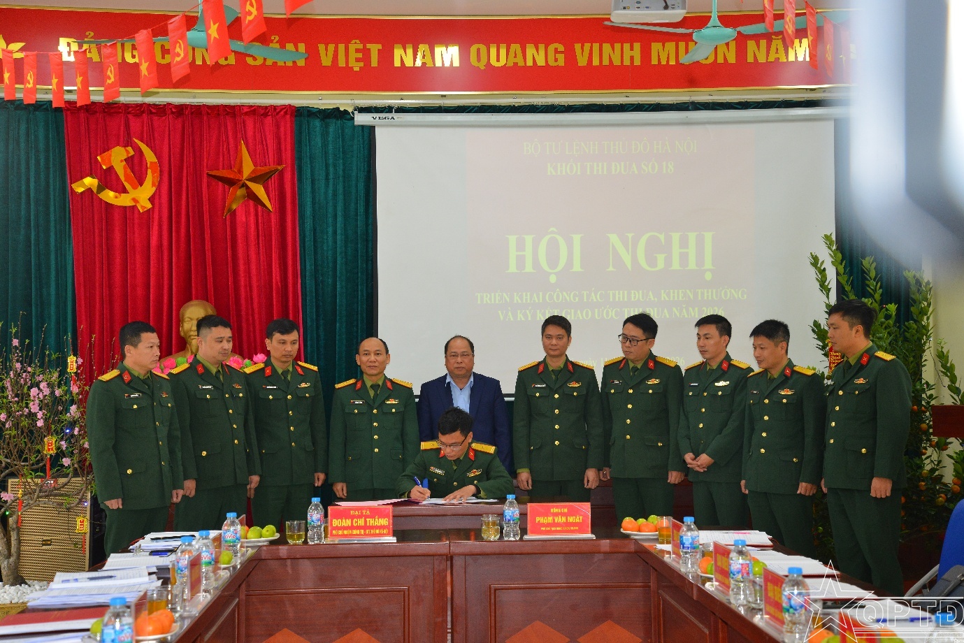 Tại Hội nghị, đại biểu các đơn vị đã tập trung thảo luận, thống nhất nội dung, chỉ tiêu và biện pháp tổ chức Phong trào Thi đua Quyết thắng năm 2026. Trên cơ sở đó, Khối thi đua số 18 đã tiến hành ký kết giao ước thi đua với chủ đề: “Đoàn kết, kỷ cương, đột phá, sáng tạo, quyết thắng”, thể hiện quyết tâm chính trị cao của cán bộ, chiến sĩ trong thực hiện nhiệm vụ quân sự, quốc phòng địa phương. Theo nội dung ký kết, các đơn vị trong Khối tập trung thi đua quán triệt sâu sắc tư tưởng Hồ Chí Minh về thi đua yêu nước; chủ trương, quan điểm của Đảng, chính sách, pháp luật của Nhà nước về thi đua, khen thưởng; các nghị quyết, chỉ thị, kết luận của Thành ủy, UBND thành phố Hà Nội và Đảng ủy, Bộ Tư lệnh Thủ đô Hà Nội về nhiệm vụ quân sự, quốc phòng trong tình hình mới. Tập trung vào nhiệm vụ trung tâm là tham mưu với cấp ủy, chính quyền địa phương xây dựng nền quốc phòng toàn dân, thế trận quốc phòng toàn dân gắn với thế trận an ninh nhân dân ngày càng vững chắc; nâng cao chất lượng tổng hợp, khả năng sẵn sàng chiến đấu của lực lượng thường trực, dân quân và dự bị động viên. Các đơn vị phấn đấu hoàn thành 100% chỉ tiêu tuyển chọn, gọi công dân nhập ngũ; tổ chức huấn luyện đúng, đủ nội dung, chương trình, kết quả kiểm tra 100% đạt yêu cầu, trên 75% khá, giỏi; tham gia hội thi, hội thao các cấp đạt kết quả cao.