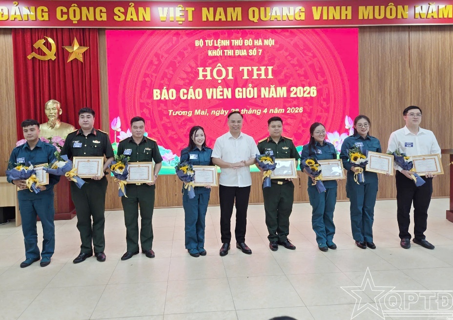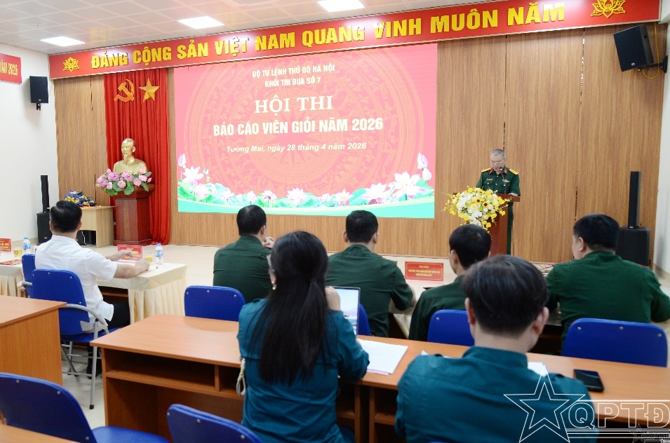 QPTĐ-Sáng 28/4/2026, Khối Thi đua số 7 Bộ Tư lệnh Thủ đô Hà Nội gồm Ban CHQS các phường: Phương Liệt, Thanh Xuân, Đại Mỗ, Từ Liêm, Tương Mai, Tây Mỗ, Khương Đình và Yên Hòa tổ chức Hội thi Báo cáo viên giỏi năm 2026.