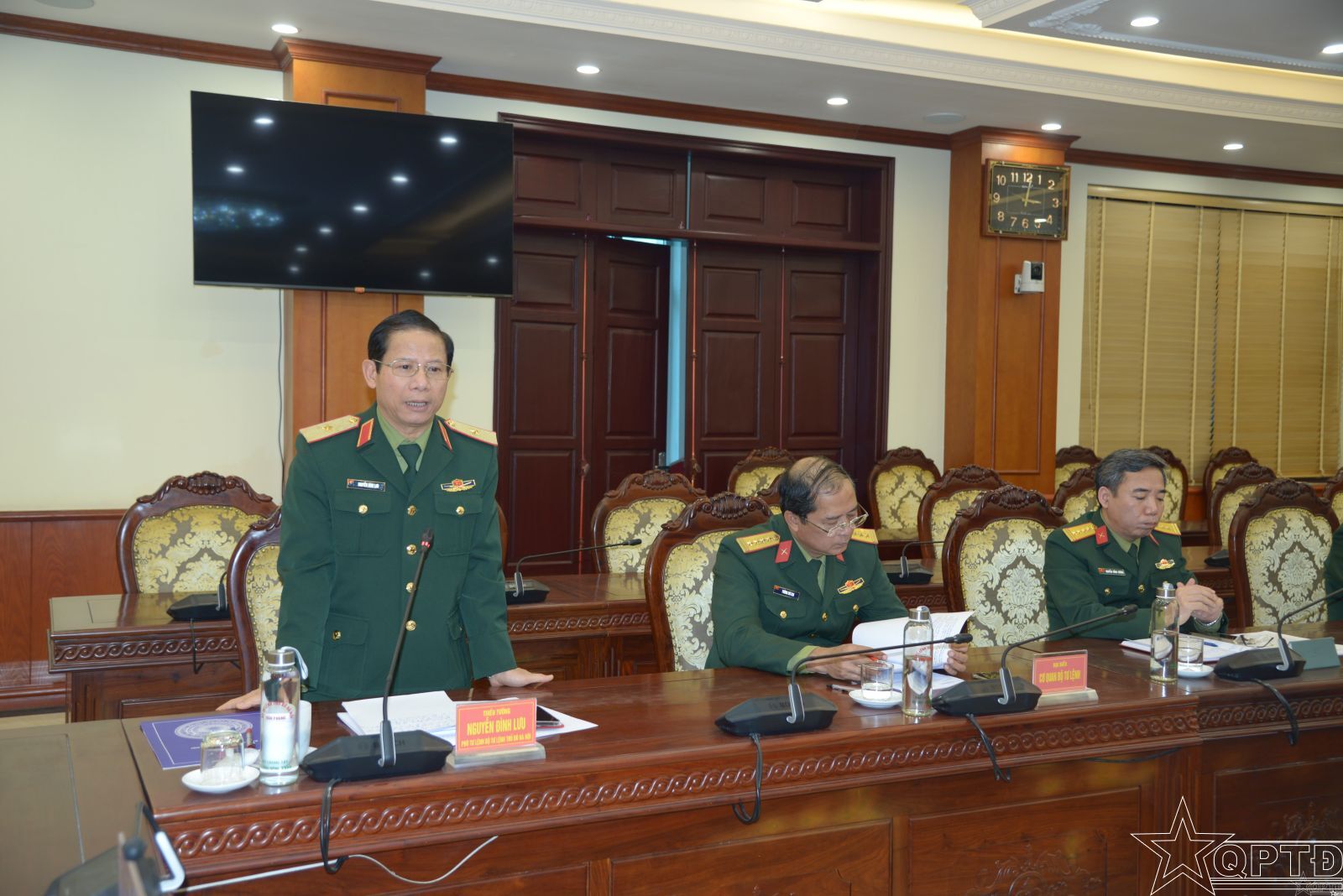 Thiếu tướng Nguyễn Đình Lưu, Phó Tư lệnh Bộ Tư lệnh Thủ đô Hà Nội, Trưởng Ban Quản lý dự án xây dựng doanh trại Trung đoàn 692 phát biểu tại buổi làm việc.
