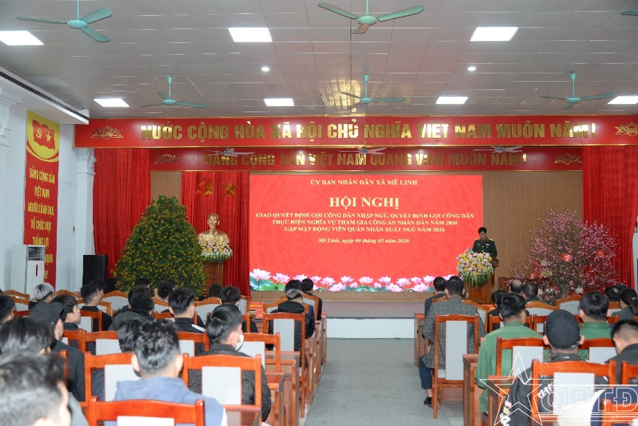 QPTĐ-Chiều 9-2, xã Mê Linh, thành phố Hà Nội tổ chức Hội nghị giao quyết định gọi công dân nhập ngũ, quyết định gọi công dân thực hiện nghĩa vụ Công an nhân dân năm 2026, gặp mặt động viên quân nhân xuất ngũ năm 2026.