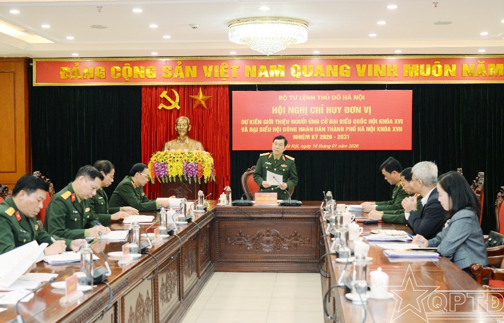 QPTĐ-Chiều 14-1, Bộ Tư lệnh Thủ đô Hà Nội tổ chức hội nghị chỉ huy đơn vị dự kiến giới thiệu người ứng cử đại biểu Quốc hội khóa XVI và đại biểu Hội đồng nhân dân (HĐND) thành phố Hà Nội khóa XVII, nhiệm kỳ 2026-2031. Thiếu tướng Nguyễn Khắc Nhân, Phó Chính ủy Bộ Tư lệnh Thủ đô Hà Nội, chủ trì hội nghị.
