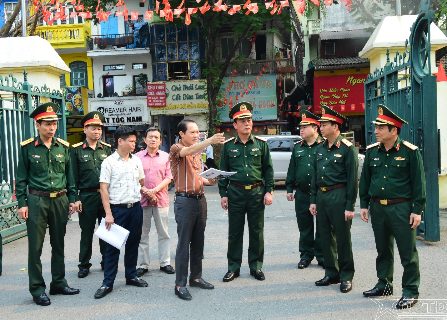 Thủ trưởng Bộ Tư lệnh Thủ đô Hà Nội nghe đơn vị tư vấn thuyết minh về phương án cải tạo cảnh quan xung quanh các hiện vật chiến tích ngoài trời.