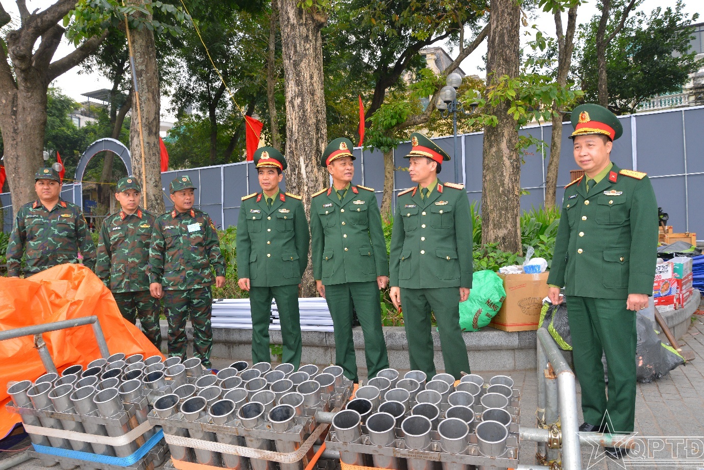 Thiếu tướng Lưu Nam Tiến kiểm tra trận địa pháo hoa trước cửa Báo Hà Nội mới.