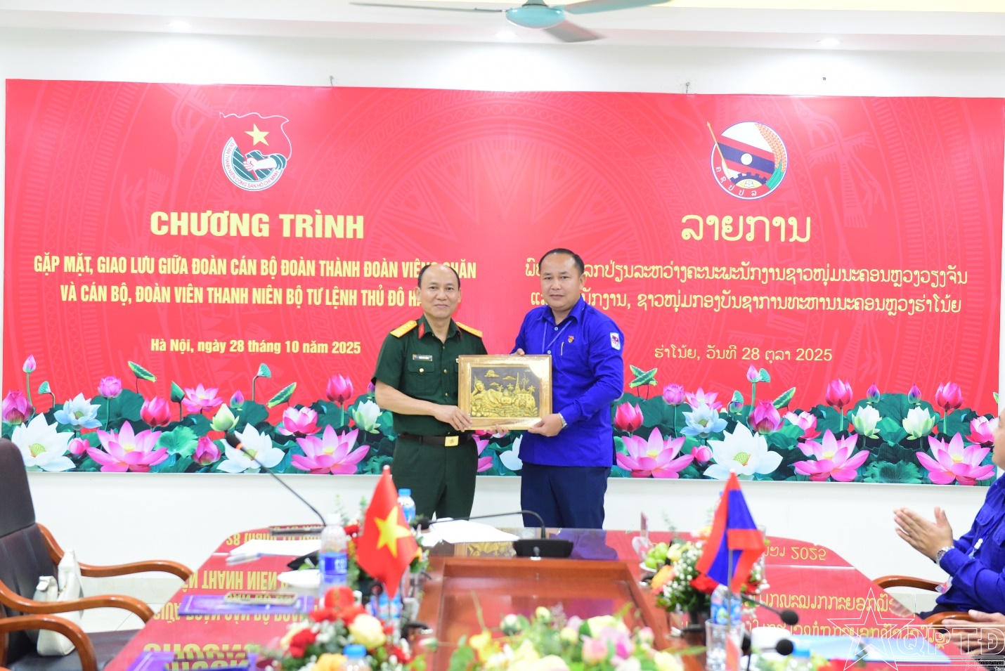 Đại diện Bộ Tư lệnh Thủ đô Hà Nội và Đoàn cán bộ Thành đoàn Viêng Chăn (Lào) trao quà lưu niệm, thể hiện tình đoàn kết, hữu nghị giữa tuổi trẻ hai Thủ đô.