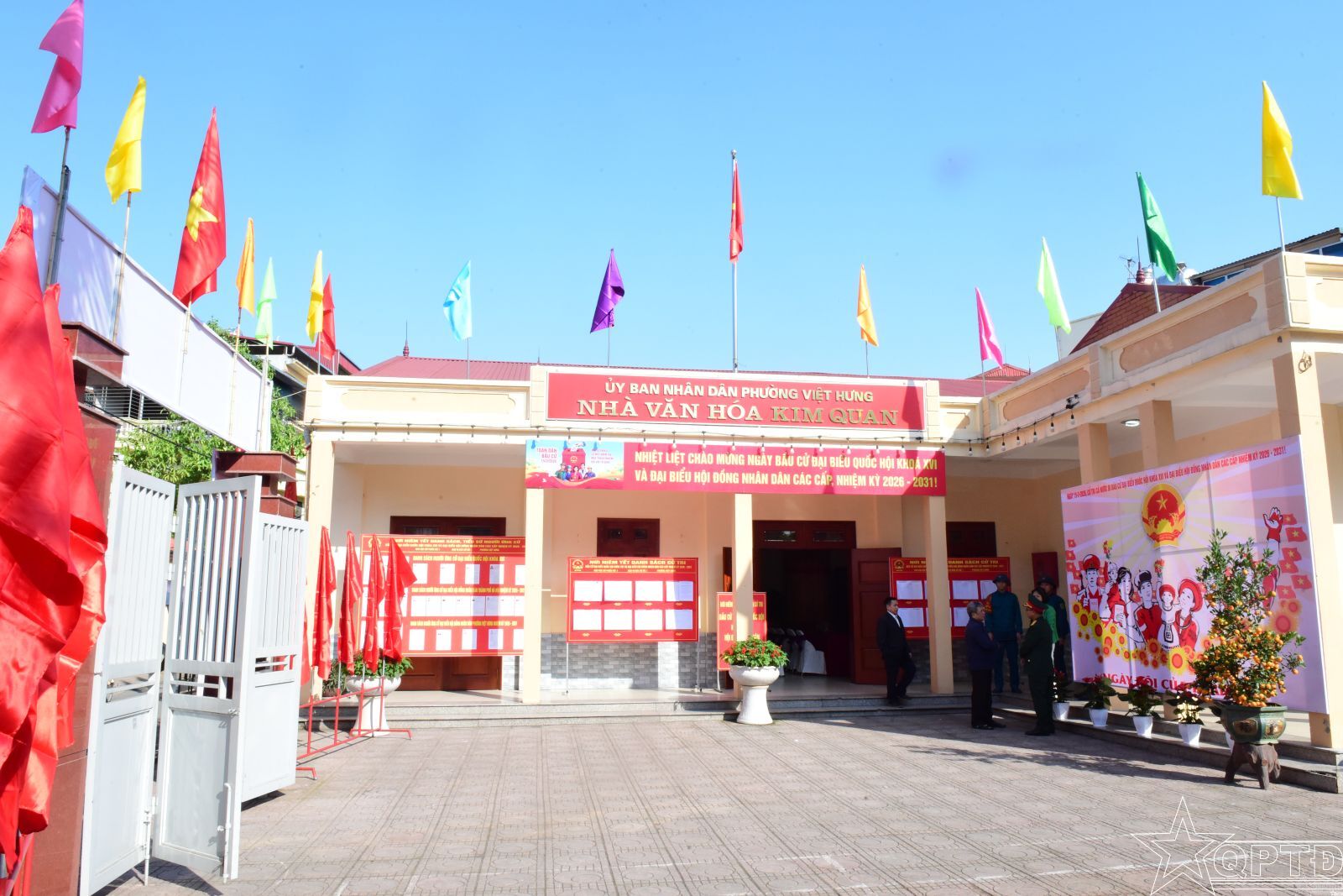 Diện mạo rực rỡ cờ hoa, băng rôn khẩu hiệu chào mừng ngày hội lớn tại các điểm bầu cử ở phường Việt Hưng.