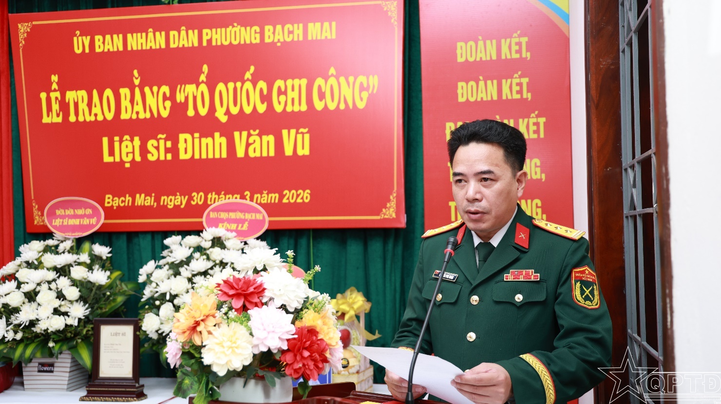 QPTĐ-Sáng 30-3, UBND phường Bạch Mai tổ chức Lễ công bố Quyết định của Thủ tướng Chính phủ và trao Bằng “Tổ quốc ghi công” cho Liệt sĩ Đinh Văn Vũ-người đã anh dũng hy sinh vì sự nghiệp đấu tranh giải phóng dân tộc, xây dựng và bảo vệ Tổ quốc.