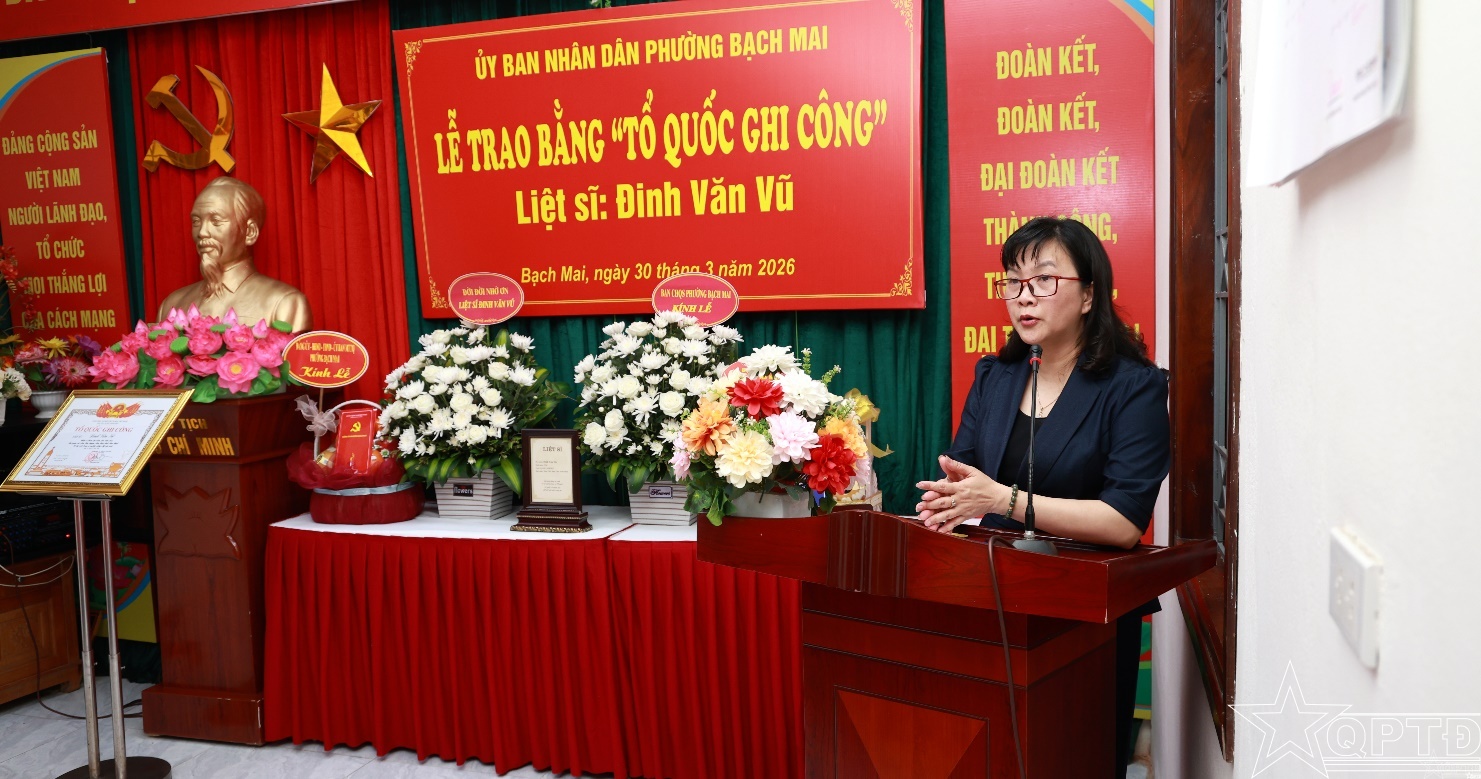 Tại buổi Lễ, lãnh đạo UBND phường Bạch Mai nhấn mạnh, việc trao Bằng “Tổ quốc ghi công” là sự ghi nhận công lao to lớn của liệt sĩ và gia đình, đồng thời thể hiện sự quan tâm sâu sắc của Đảng, Nhà nước đối với những người có công với cách mạng.