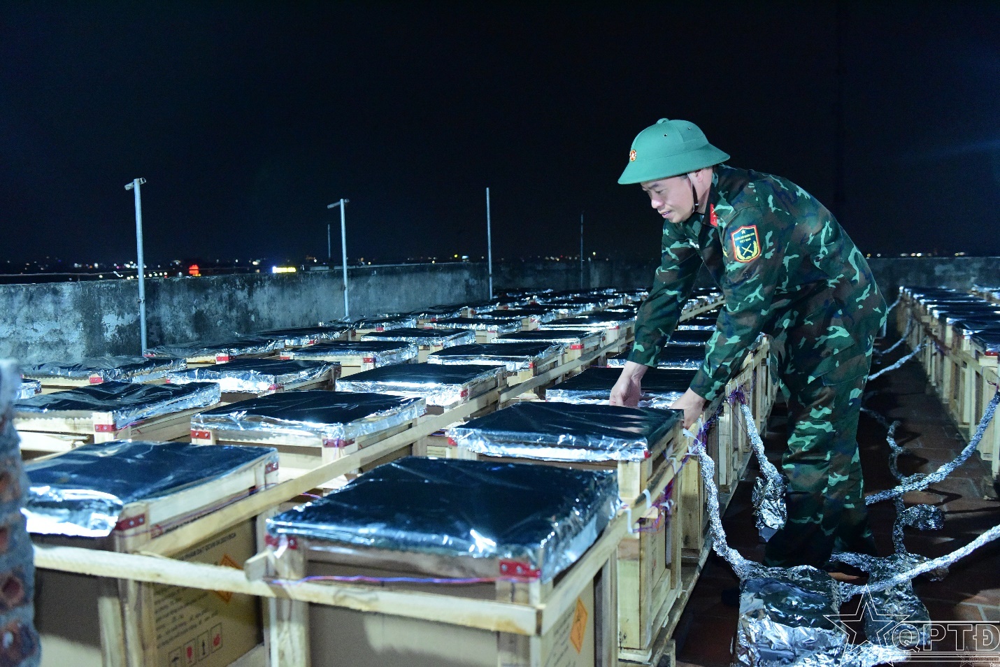 Lực lượng chức năng thực hiện các bước đấu nối và kiểm tra cuối cùng đối với 120 giàn pháo hoa tại sân thượng trụ sở Ban Chỉ huy PTKV2 - Phúc Thọ.