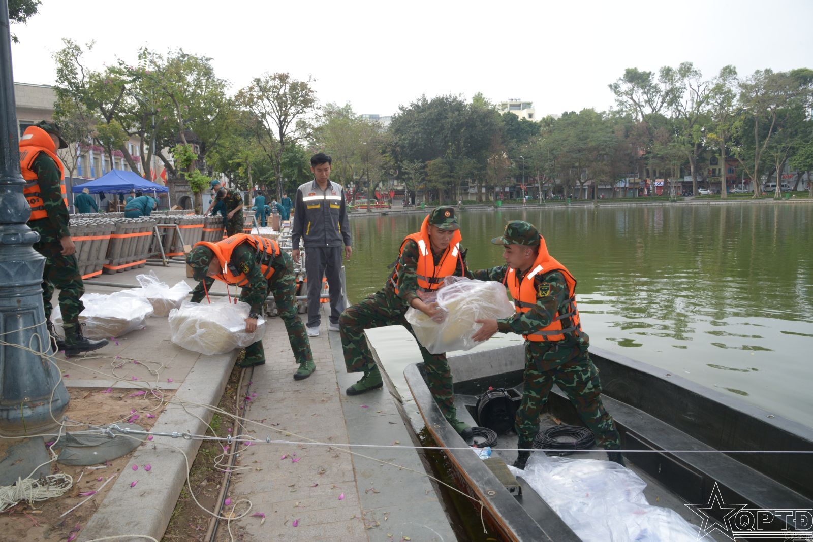 Cán bộ, chiến sĩ Tiểu đoàn Công binh 544 triển khai phương tiện, thiết bị bắn pháo hoa ra các cụm hỏa thuật.