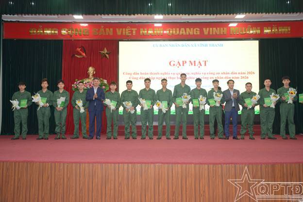 QPTĐ-Sáng 27-2, xã Vĩnh Thanh đã tổ chức gặp mặt, tặng quà, khen thưởng công dân chuẩn bị lên đường nhập ngũ, công dân thực hiện nghĩa vụ tham gia Công an nhân dân và quân nhân xuất ngũ trở về địa phương năm 2026.