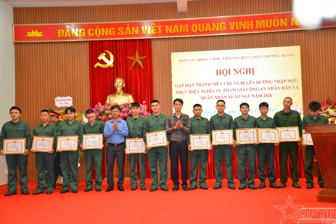 QPTĐ-Sáng 27/2, xã Chương Dương đã tổ chức gặp mặt thanh niên chuẩn bị lên đường nhập ngũ, tham gia thực hiện nghĩa vụ Công an nhân dân năm 2026 và quân nhân hoàn thành nghĩa vụ trở về địa phương.