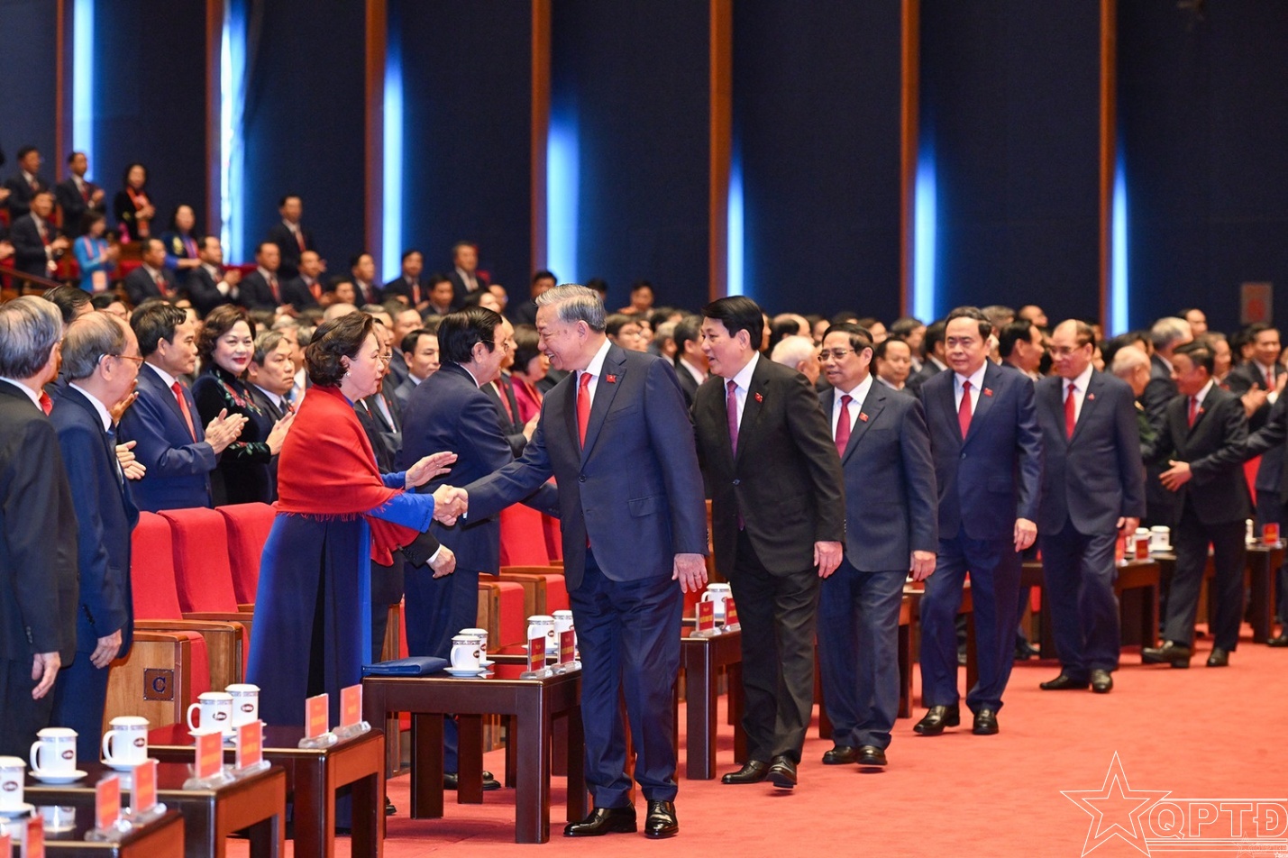 Thay mặt Đoàn Chủ tịch Đại hội, đồng chí Trần Cẩm Tú, Ủy viên Bộ Chính trị, Thường trực Ban Bí thư, giới thiệu đại biểu và khách mời của Đại hội gồm các đồng chí: Nguyên Tổng Bí thư Nông Đức Mạnh; nguyên Ủy viên Bộ Chính trị; nguyên Chủ tịch nước Nguyễn Minh Triết; nguyên Chủ tịch nước Trương Tấn Sang; nguyên Thủ tướng Chính phủ Nguyễn Tấn Dũng; nguyên Chủ tịch Quốc hội Nguyễn Văn An; nguyên Chủ tịch Quốc hội Nguyễn Sinh Hùng; nguyên Chủ tịch Quốc hội Nguyễn Thị Kim Ngân; các đồng chí nguyên Ủy viên Bộ Chính trị, nguyên Bí thư Trung ương Đảng, nguyên lãnh đạo Đảng, Nhà nước, Mặt trận Tổ quốc Việt Nam; các đồng chí nguyên Ủy viên Trung ương Đảng các khóa; các đồng chí Ủy viên Ủy ban Kiểm tra Trung ương khóa XIII; các đồng chí lão thành cách mạng, Mẹ Việt Nam Anh hùng, nhân sĩ, trí thức, văn nghệ sĩ, chức sắc tôn giáo tiêu biểu và đại diện thế hệ trẻ; các vị đại sứ, đại biện các nước, trưởng đại diện các tổ chức quốc tế thường trú và không thường trú tại Việt Nam.