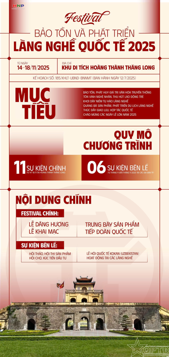QPTĐ-UBND thành phố Hà Nội sẽ phối hợp cùng Bộ Nông nghiệp và Môi trường triển khai 11 sự kiện chính và 6 sự kiện bên lề tại Festival Bảo tồn và Phát triển làng nghề quốc tế năm 2025. Chuỗi hoạt động dự kiến có sự tham gia của các doanh nghiệp, làng nghề, nghệ nhân, thợ giỏi tiêu biểu trong nước và quốc tế.
